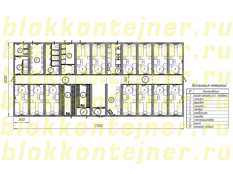 Модульное здание «Общежитие для рабочих на 52 человека»   в 1-этаж, размер: (12,0 *27,5*3,0м) состоит из 22 единиц БК размер 5,0*2,4*2,5м: